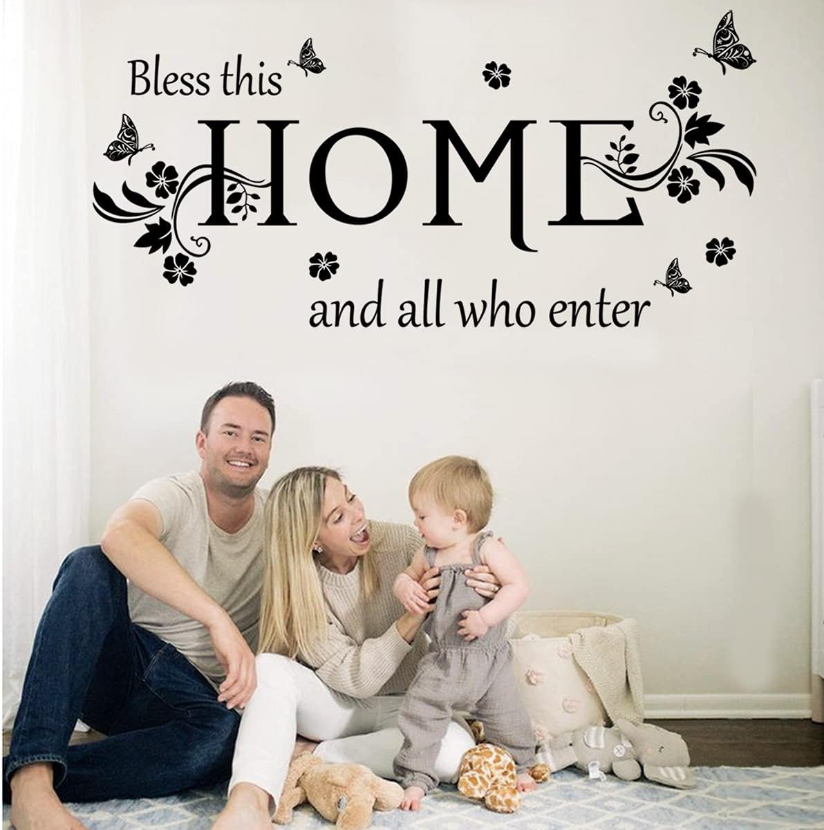 This vinyl wall sticker features the phrase "Bless This Home and All who Enter" along with beautiful flowers and butterflies, making it a lovely addition to any entryway or living room. The black color adds a touch of elegance to your home decor. Easy to apply and remove, this wall decal comes in one piece. Perfect for those who want to add a personal touch to their living space.